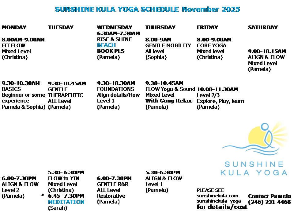 Join our Sunshine Kula community. Prices & online info are BELOW the schedule. Pay Cash at the door or card payments below. Take a look at the ‘Classes‘ page for details.