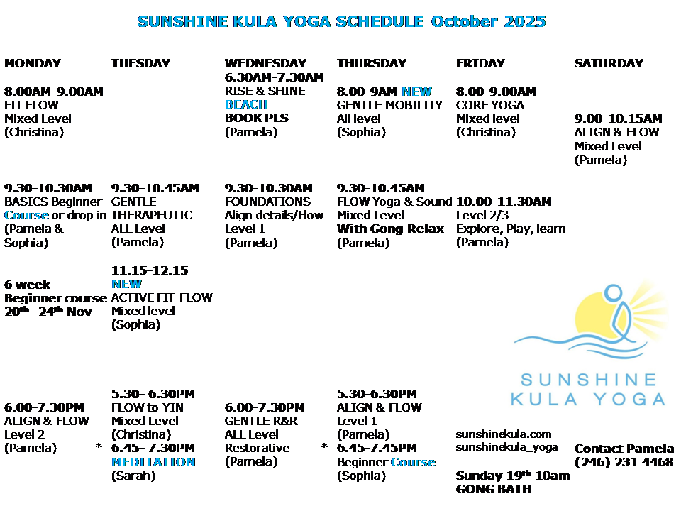 Join our Sunshine Kula community. Prices & online info are BELOW the schedule. Pay Cash at the door or card payments below. Take a look at the ‘Classes‘ page for details.